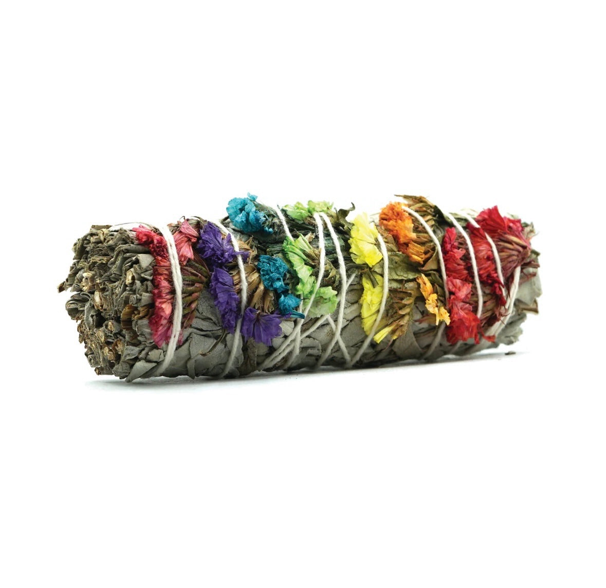 7 CHAKRA SINUATA FLOWER AND WHITE SAGE SMUDGE STICK BUNDLE